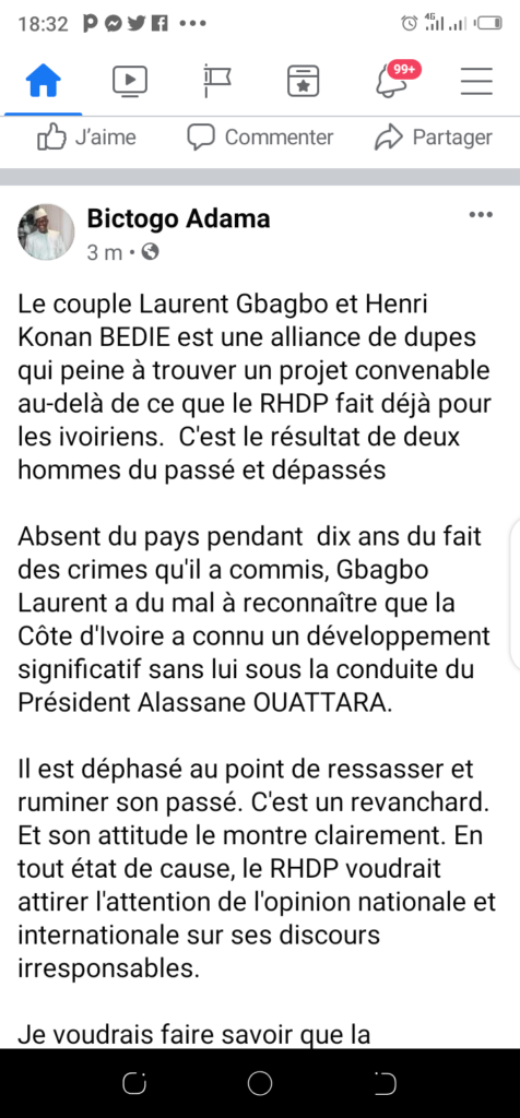 Suite à la visite de l’ex-président Laurent Gbagbo chez Henri Konan Bédié, le secrétaire exécutif du RHDP, Adama Bictogo,s’adresse sur sa page Facebook aux deux ex-présidents.